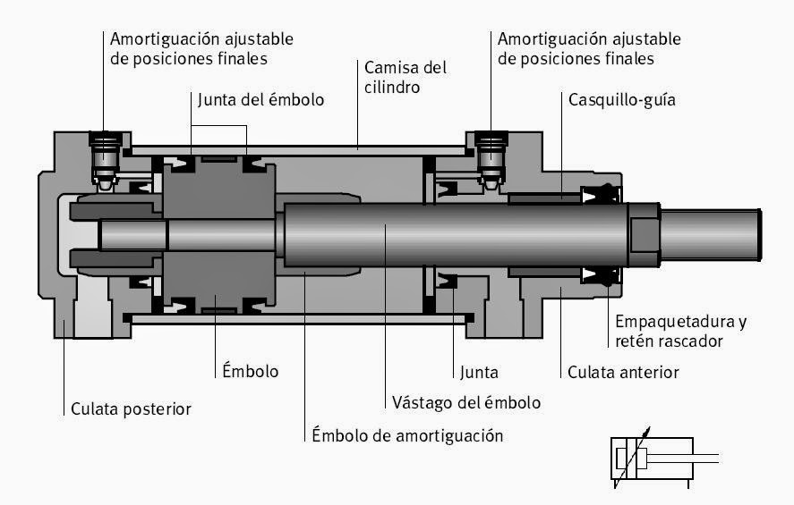 El rascador protector es esencial para mantener la empaquetadura y el cilindro trabajando de forma limpia y eficiente. Cilindros neumáticos de AVENTICS: cilindros con y sin vástago de émbolo,. El cilindro neumático consiste en un cilindro cerrado con un pistón en su interior que desliza y. El vástago se acopla mecánicamente con el émbolo del cilindro, cerrando la unión. Un buen actuador neumático debe tener las siguientes características: .